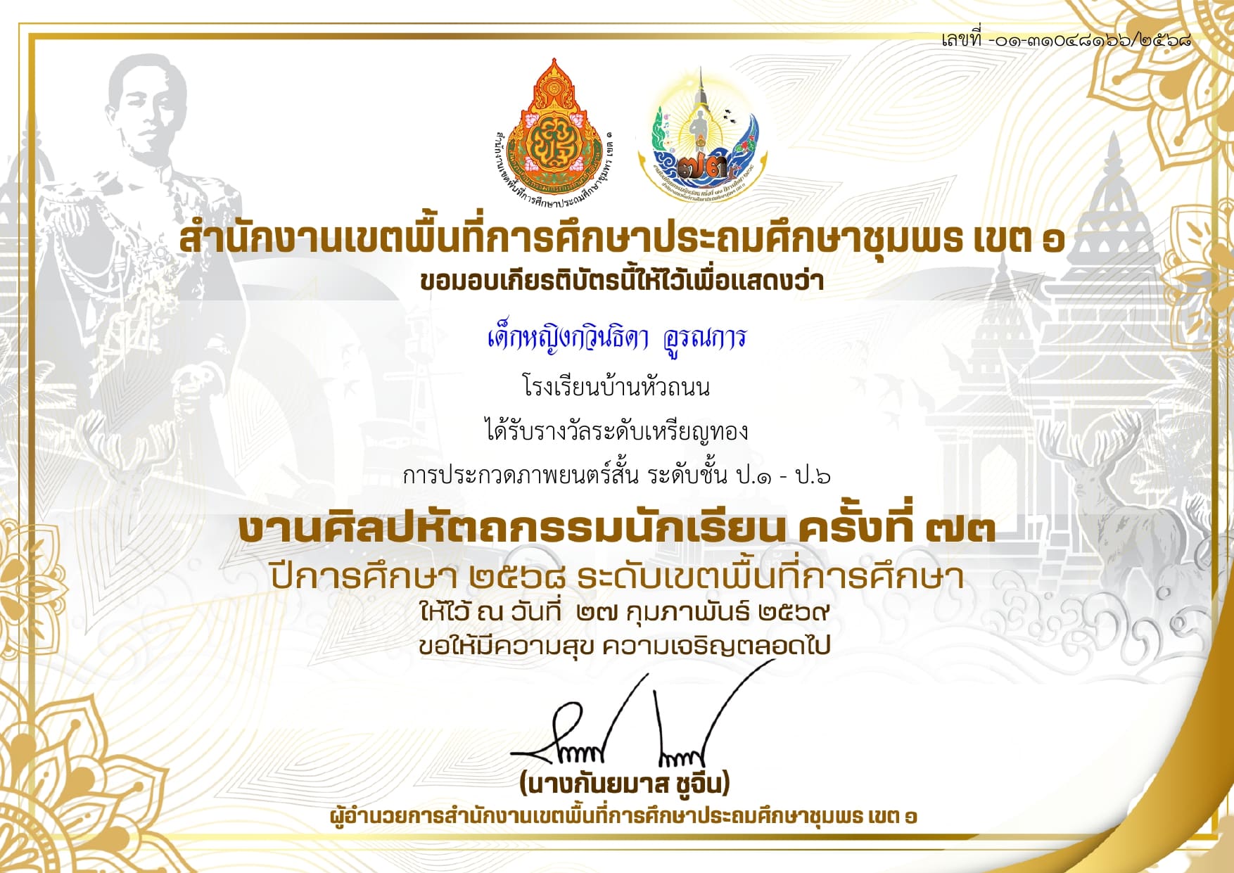 รางวัลระดับเหรียญทอง การประกวดภาพยนตร์สั้น ระดับชั้น ป.1-ป.6