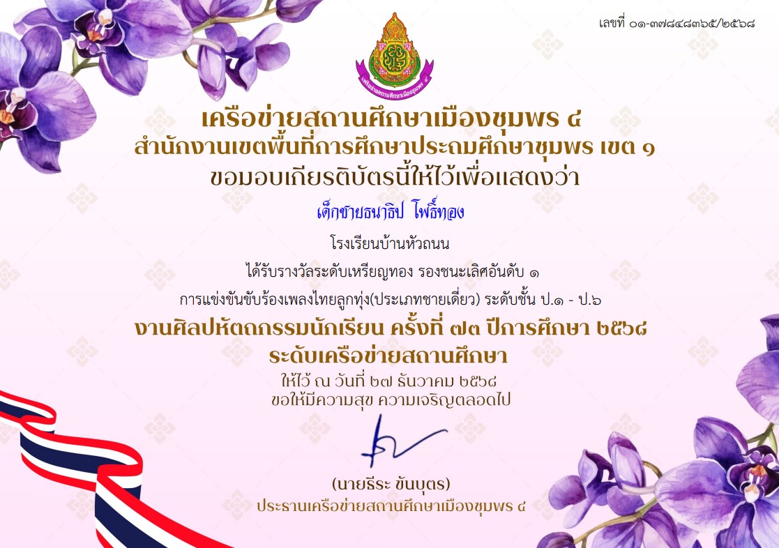 รางวัลระดับเหรียญทอง การแข่งขันขับร้องเพลงไทยลูกทุ่ง(ประเภทชายเดี่ยว) ระดับชั้น ป.๑ - ป.๖