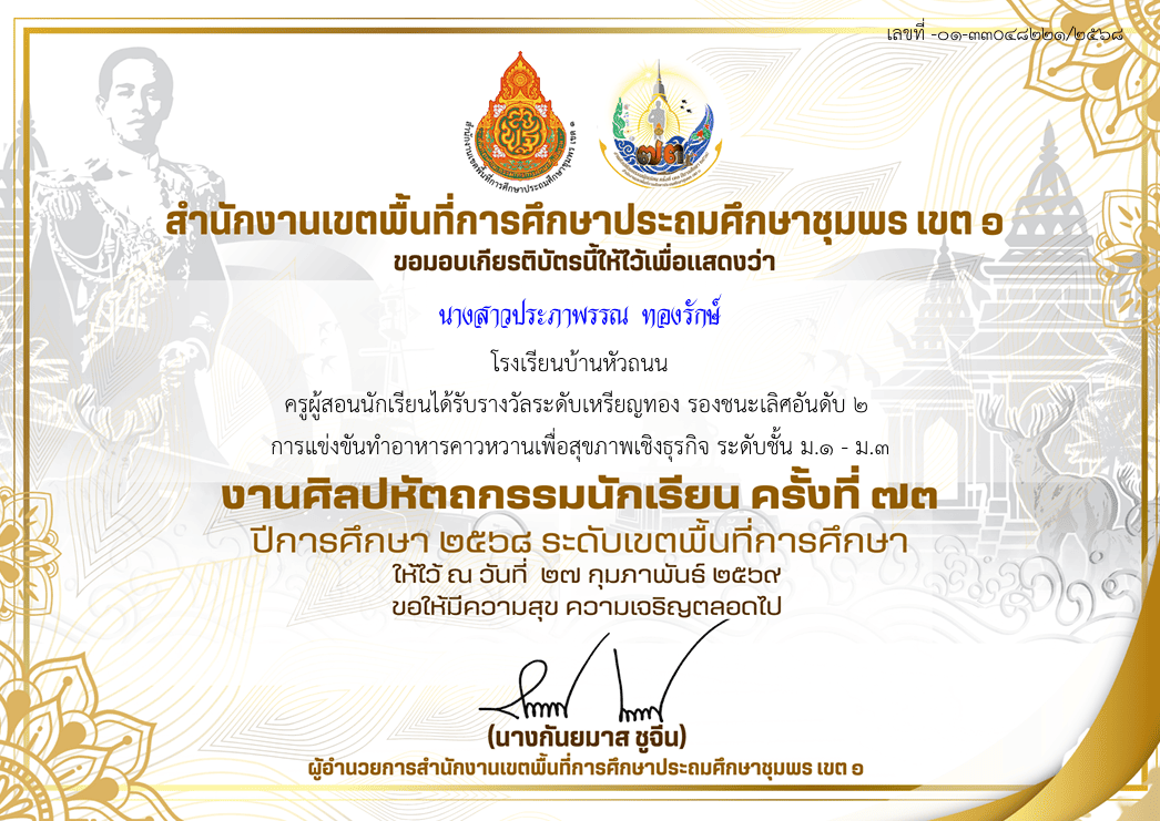 ชื่อ : รางวัลระดับเหรียญทอง รองชนะเลิศอันดับ 2 การแข่งขันทําอาหารคาวหวานเพื่อสุขภาพเชิงธุรกิจ ระดับชั้น ม.1-ม.3