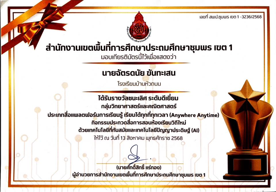 รางวัลชนะเลิศ ระดับดีเยี่ยม ในหัวข้อสื่อแพลตฟอร์มการเรียนรู้ เรียนได้ทุกที่ทุกเวลา (Anywhere Anytim)