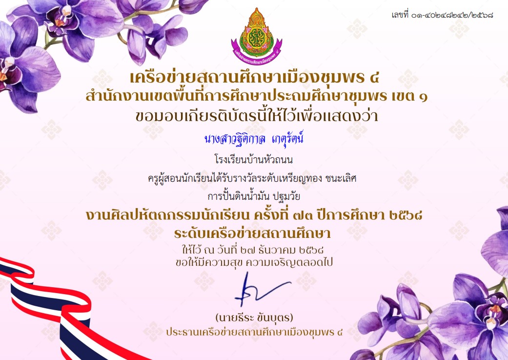 รางวัลระดับ เหรียญทอง ชนะเลิศ การปั้นดินน้ำมัน ปฐมวัย