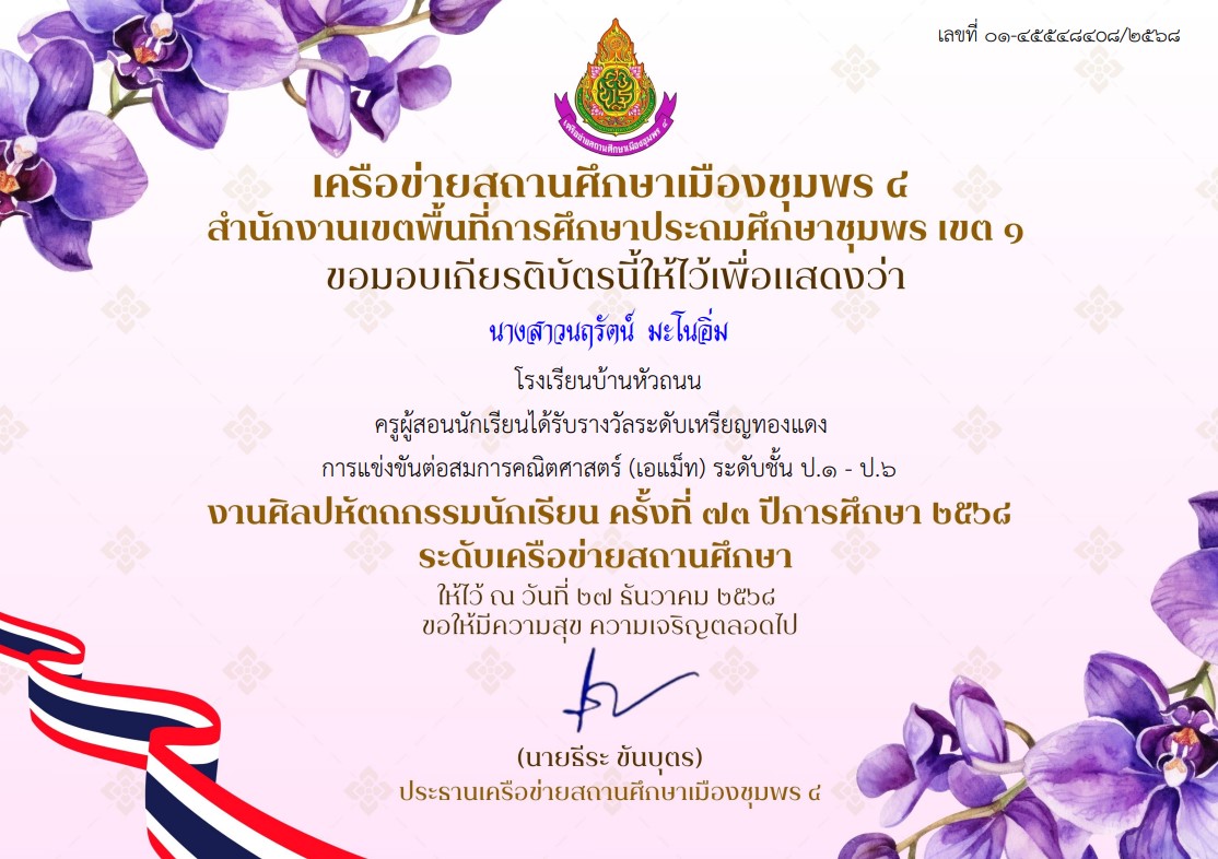 รางวัลระดับ เหรียญทองแดง การแข่งขันต่อสมการคณิตศาสตร์ (เอแม็ท) ระดับชั้น ป.1 - ป.6