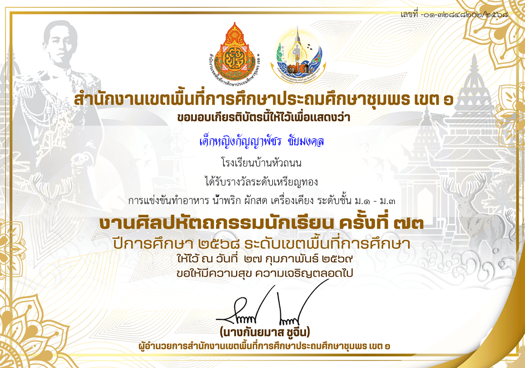 รางวัลระดับเหรียญทอง รองชนะเลิศอันดับ 2 การแข่งขันทําอาหารคาวหวานเพื่อสุขภาพเชิงธุรกิจ ระดับชั้น ม.1-ม.3