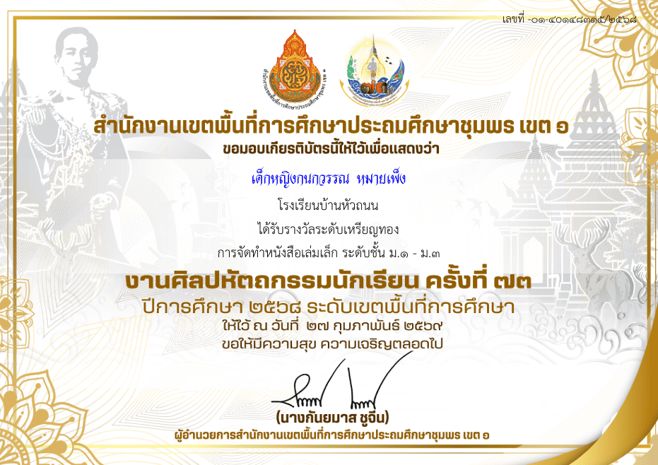 รางวัลระดับเหรียญทอง การจัดทำหนังสือเล่มเล็ก ระดับชั้น ม.1-ม.3