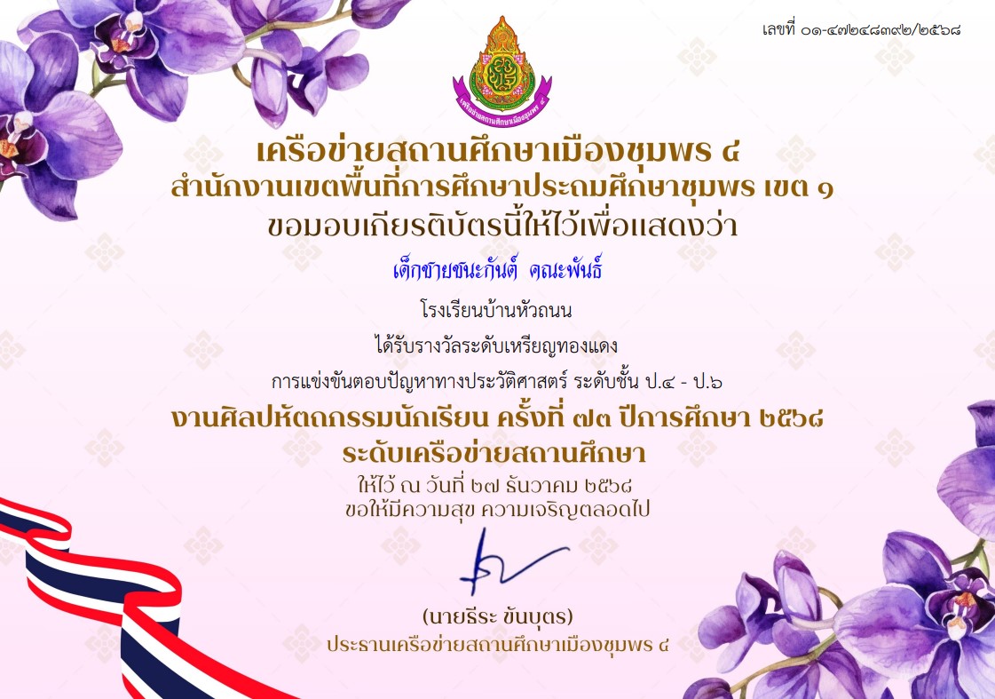 รางวัลระดับเหรียญทองแดง การแข่งขันตอบปัญหาทางประวัติศาสตร์ ระดับชั้น ป.๔ - ป.๖