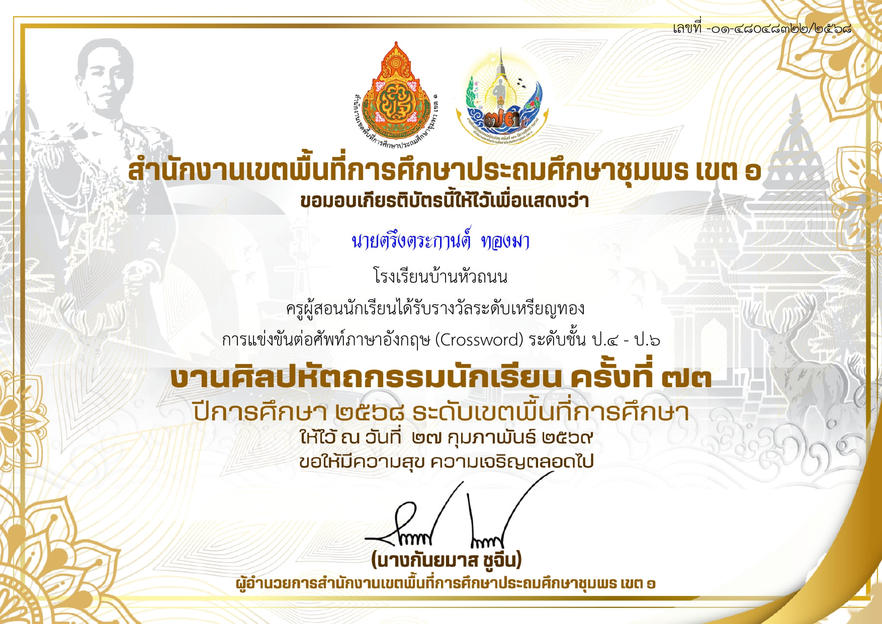 รางวัลระดับเหรียญทอง การแข่งขันต่อศัพท์ภาษาอังกฤษ (Crossword) ระดับชั้น ป.4-ป.6